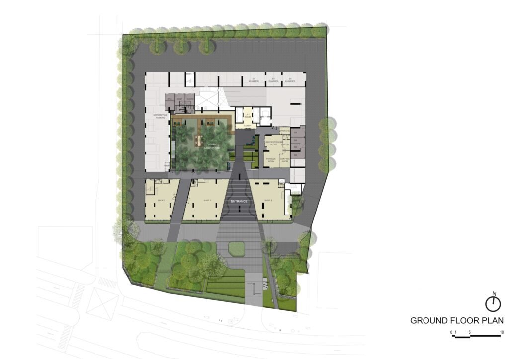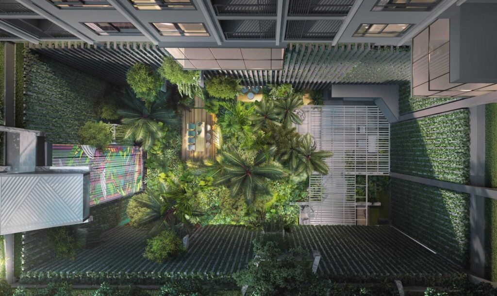 Urban Courtyard: Nestled at the base, this green space offers residents a refreshing oasis amidst the urban setting.