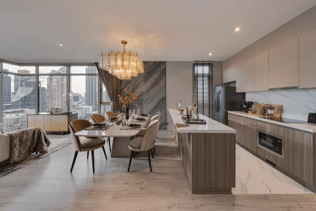 The design of the Rhythm Ekkamai Estate aims for timeless elegance, combining modern elements with classic flair. The clean lines of the architecture and the generous glass facades are intended to promote spaciousness and natural light. The construction emphasizes balancing urbanity with a retreat, using high-quality materials such as marble and fine wood to highlight the project’s exclusive character and create a cozy atmosphere. The thoughtful design ensures that every detail caters to the needs of residents, resulting in a harmonious living environment.